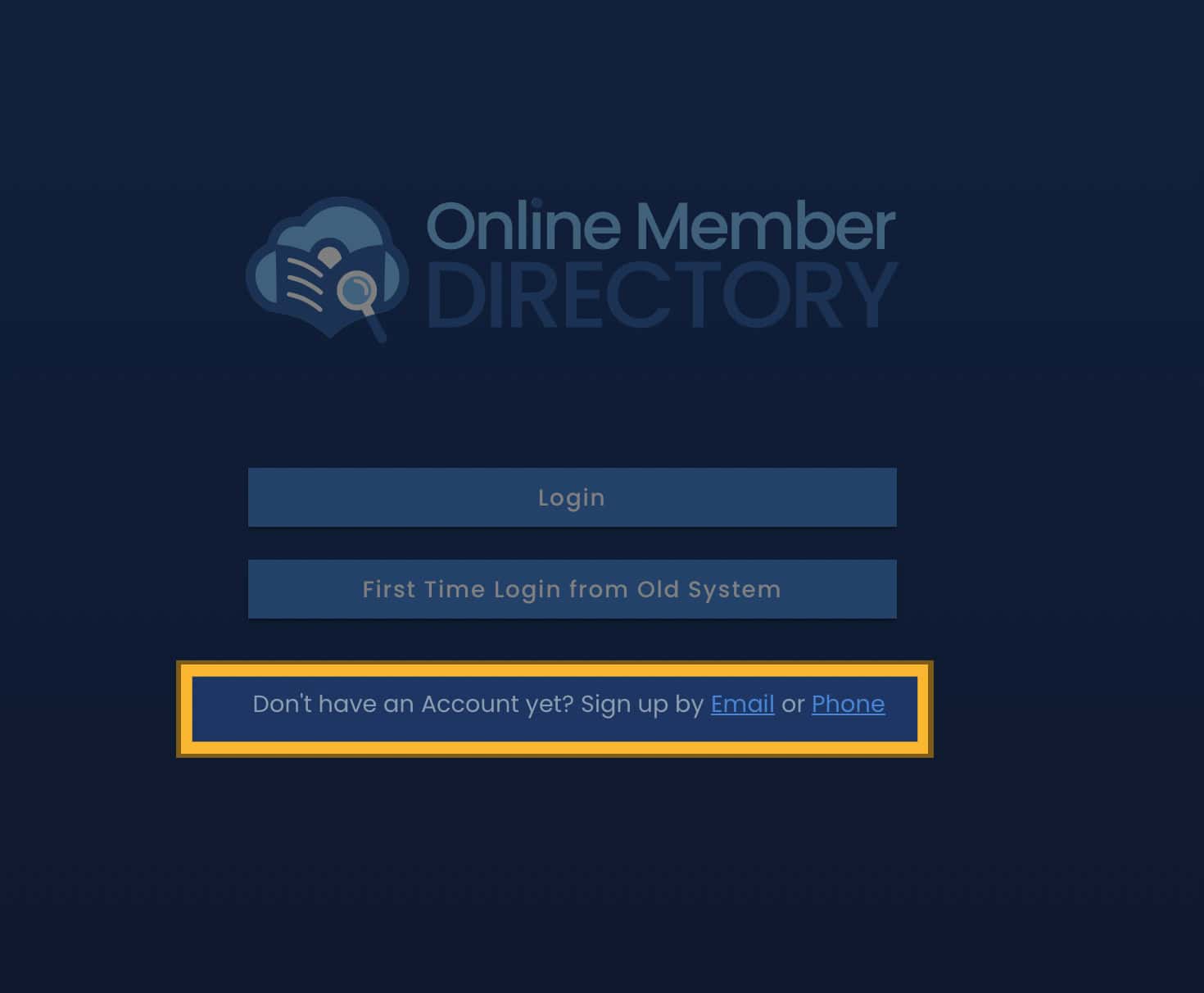 Visit the login page here: app.onlinememberdirectory.com and click a Sign Up option (under the login button).